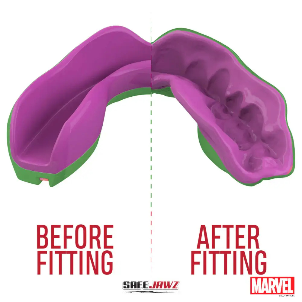 The SAFEJAWZ Marvel Series mouthguards have Fluid Fit™ Technology which means that these SAFEJAWZ® guards feature a super-slim profile and great retentive qualities. The guard will essentially clip onto the teeth and fit comfortably so that breathing, talking and drinking will not be a problem.